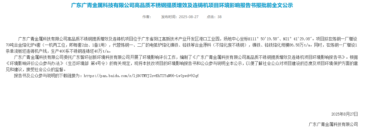 2025年8月27日,廣東廣青金屬科技有限公司高品質不銹鋼提質增效及連鑄機項目環境影響報告書報批前全文公示。