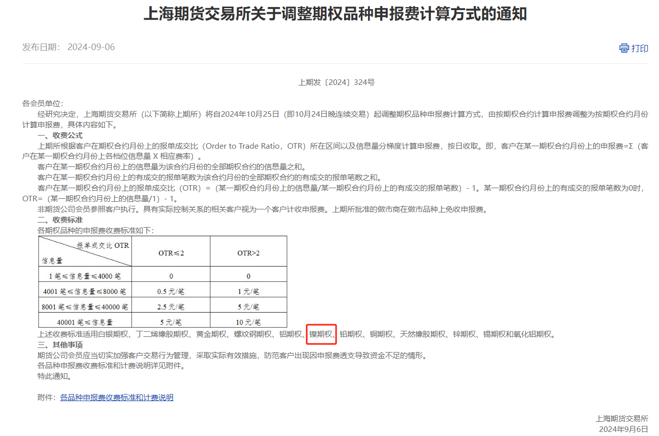 鎳期權(quán)申報費將自2024年10月25日起調(diào)整