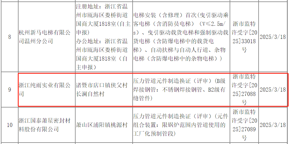 2024年3月24日,浙江省市場(chǎng)監(jiān)督管理局就特種設(shè)備許可受理情況(2025年第012批)對(duì)外進(jìn)行公告,據(jù)顯示,浙江純雨實(shí)業(yè)有限公司于3月18日申請(qǐng)壓力管道元件制造換證(評(píng)審)(B級(jí)焊接鋼管:不銹鋼焊接鋼管、B2級(jí)有縫管件)。