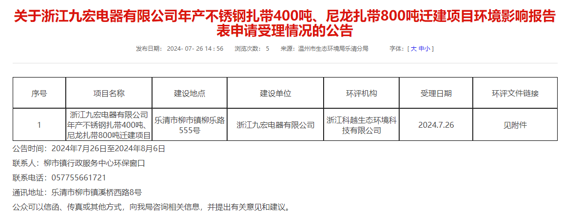 7月26日,溫州市生態環境局樂清分局受理浙江九宏電器有限公司年產不銹鋼扎帶400噸、尼龍扎帶800噸遷建項目環境影響報告表并對外進行公告,公告時間:2024年7月26日至2024年8月6日。